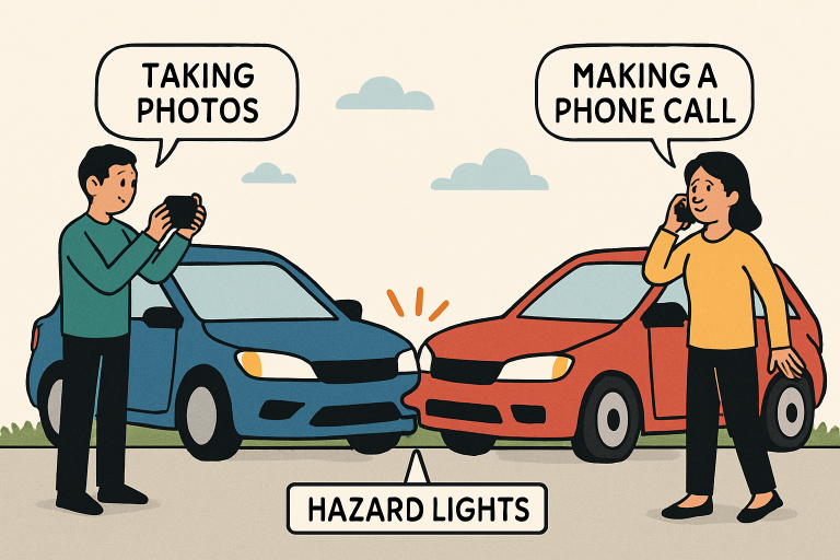 Immediately after a car accident, focus on safety first. Check yourself and any passengers for injuries. If it’s safe and your vehicle is drivable, pull off to a secure area away from traffic, such as the shoulder or a nearby parking lot. Turn on your hazard lights to alert approaching drivers. If moving the car isn’t possible, stay inside with your seatbelt fastened until help arrives, especially on busy roads where exiting could be dangerous.